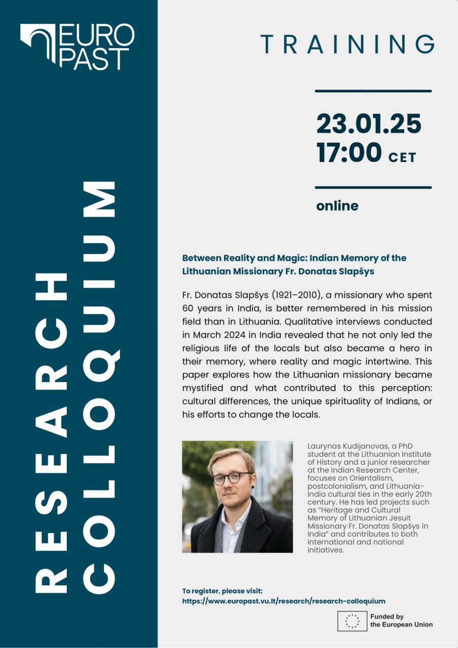 The first EUROPAST Research Colloquium of the year will take place on 23 January at 6pm. Laurynas Kudijanovas, a PhD student at the Lithuanian Institute of History and a Junior Research Fellow at the Centre for Indian Studies, will present a paper entitled "Between Reality and Magic: Indian Memory of the Lithuanian Missionary Fr. Donatas Slapšys".
