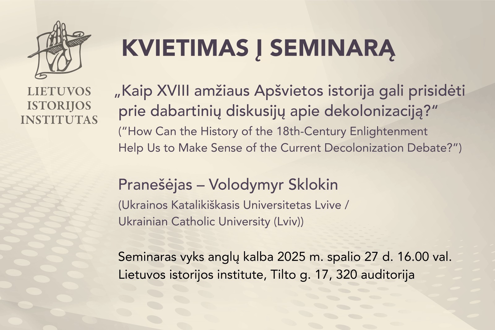Kvietimas į Ukrainos katalikiškojo universiteto istoriko V. Sklokino seminarą