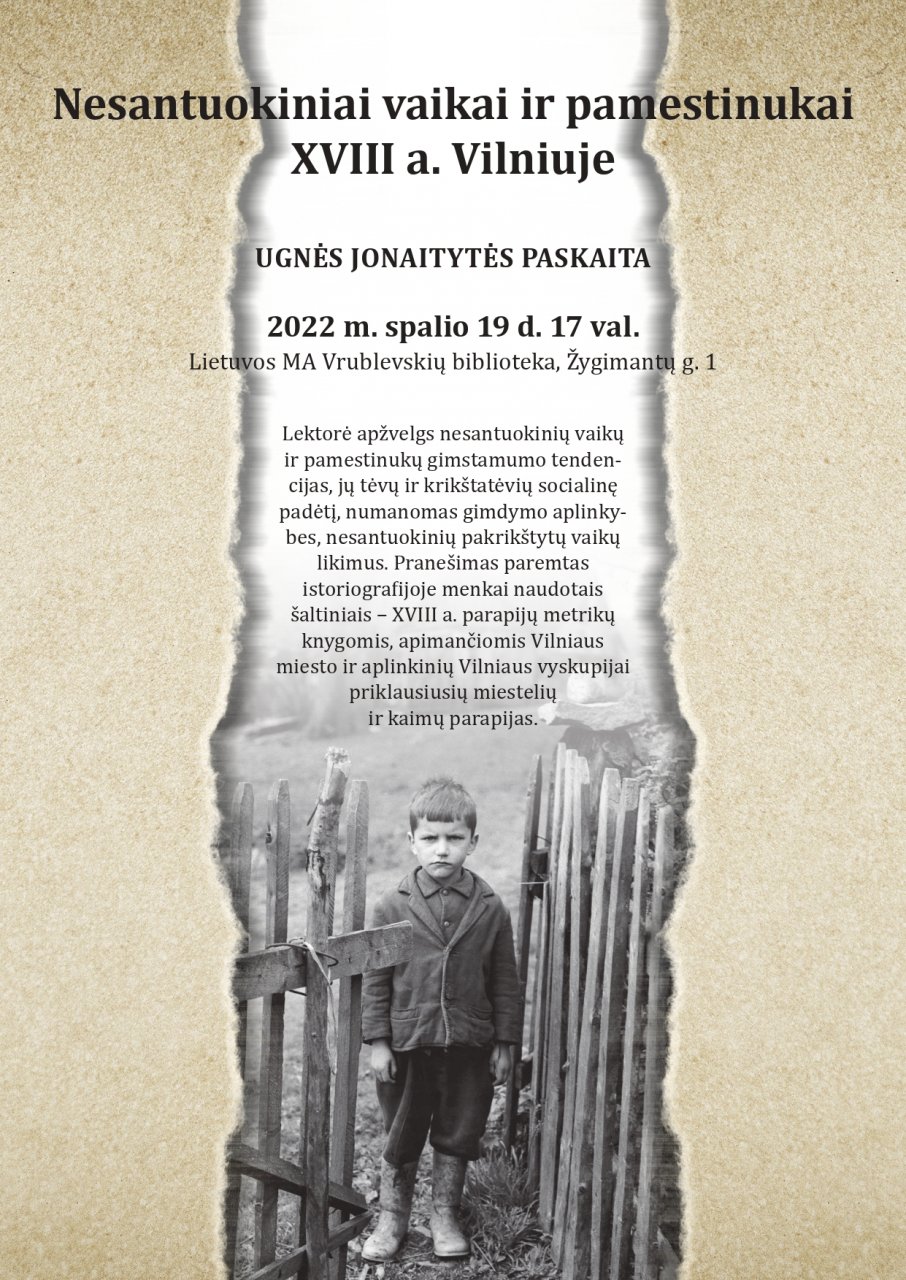 Kviečiame į Lietuvos istorijos instituto doktorantės Ugnės Jonaitytės paskaitą „Nesantuokiniai vaikai ir pamestinukai XVIII a. Vilniuje“, kuri vyks spalio 22 d., 17 val. Vrublevskių MA bibliotekoje (Žygimantų g. 1, Vilnius).
