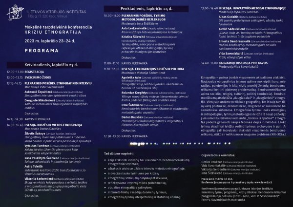 2023 m. lapkričio 23–24 d. kviečiame dalyvauti mokslinėje tarpdalykinėje konferencijoje „Krizių etnografija“, kuri vyks Lietuvos istorijos institute (Tilto g. 17, Vilnius), Posėdžių salėje (320 kab.).