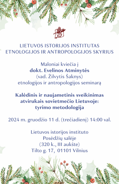 Lietuvos istorijos instituto Etnologijos ir antropologijos skyrius kviečia į doktorantės Evelinos Atminytės seminarą „Kalėdinis ir naujametinis sveikinimas atvirukais sovietmečio Lietuvoje: tyrimo metodologija“, kuris vyks Lietuvos istorijos instituto posėdžių salėje (320 k., III aukšte), 2024 m. gruodžio 11 d. (trečiadienį) 14:00 val.